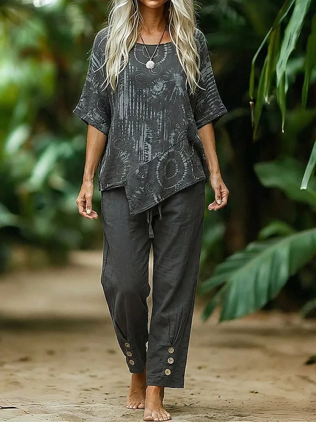 Modernes Baumwoll-Leinen-Zweiteiler-Set mit Rundhalsausschnitt und Druck. Jetzt stilvoll durch den Sommer shoppen.