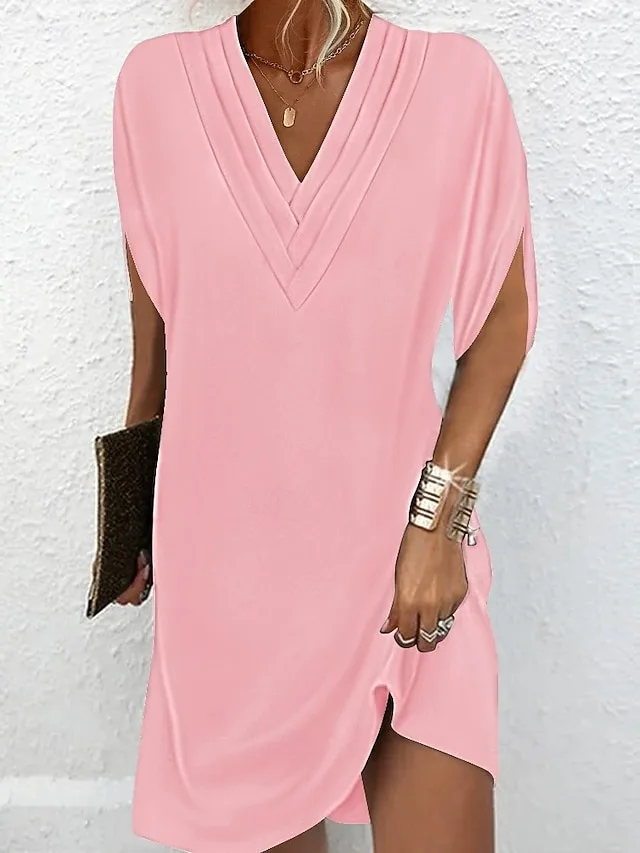 Stilvolles Midikleid in A-Linie mit V-Ausschnitt und Kurzarm. Perfekt für Frühling und Sommer – jetzt entdecken.
