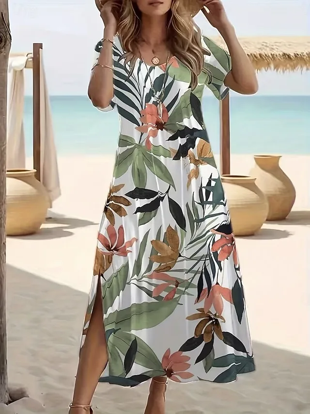 Lässiges Blumen-Maxikleid mit V-Ausschnitt und Kurzarm. Perfekt für Strand, Urlaub und entspannte Sommertage – jetzt entdecken.