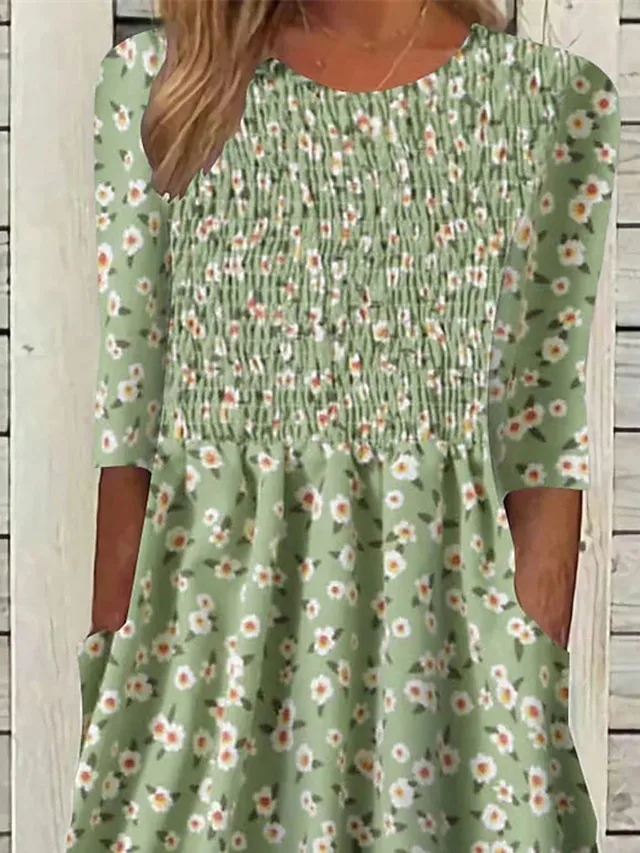 Lässiges Midikleid in A-Linie mit Blumenmuster, V-Ausschnitt und Dreiviertelarm. Jetzt stilvoll entdecken.