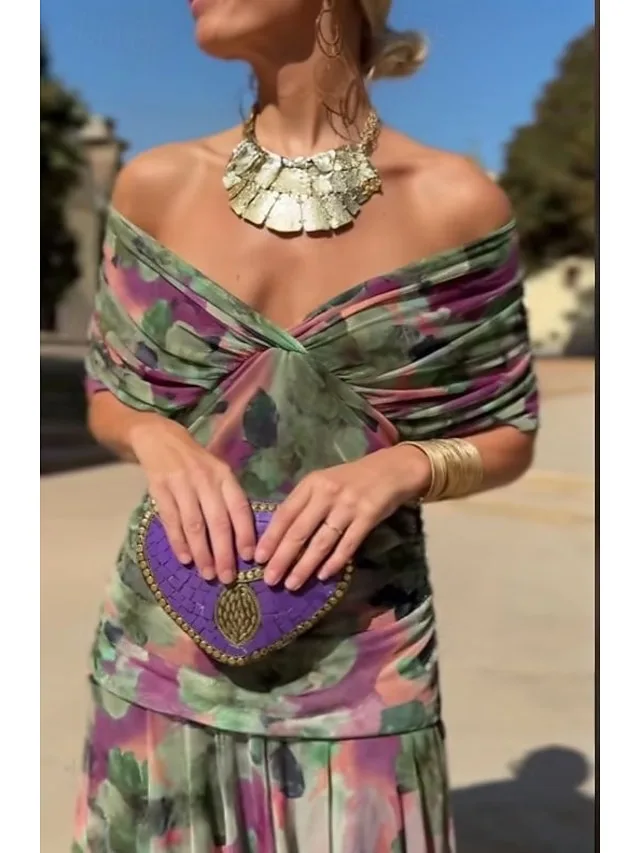 Modernes Blumen-Maxikleid mit V-Ausschnitt und Kurzarm. Perfekt für Urlaub, Strand und Freizeit – jetzt entdecken.