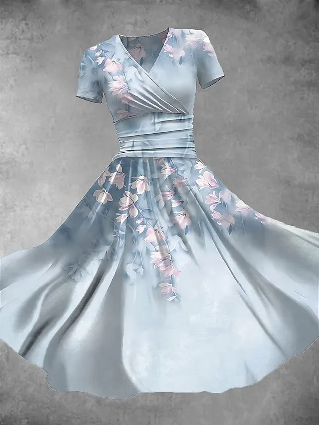 Elegantes Blumen-Midikleid mit V-Ausschnitt und Kurzarm für Sommer, Urlaub und besondere Anlässe. Jetzt stilvoll entdecken.