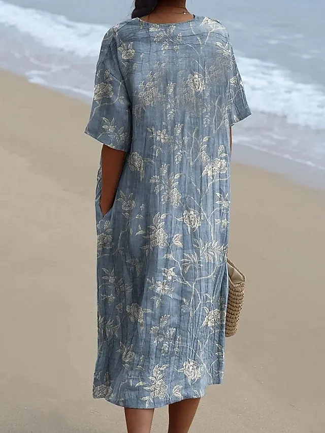 Elegantes Blumen-Midikleid mit lockerer Passform, Rundhalsausschnitt und Taschen. Perfekt für Alltag, Urlaub und warme Tage.