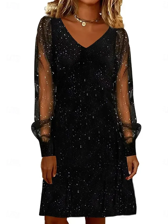 Stilvolles Cocktailkleid mit Sternmuster, V-Ausschnitt und Langarm. Perfekt für Partys und festliche Abende – jetzt entdecken.