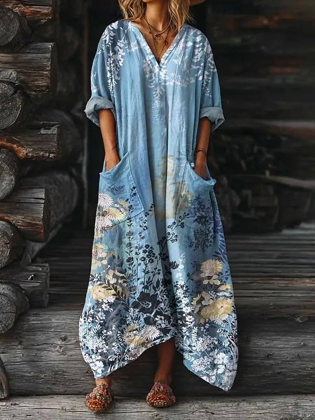 Casual boho maxi dress with floral print, V-neck, and long sleeves. Perfect for vacation, leisure, and stylish transitional looks.