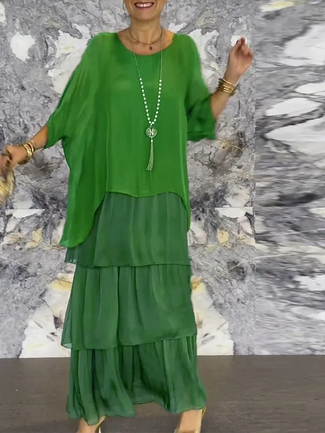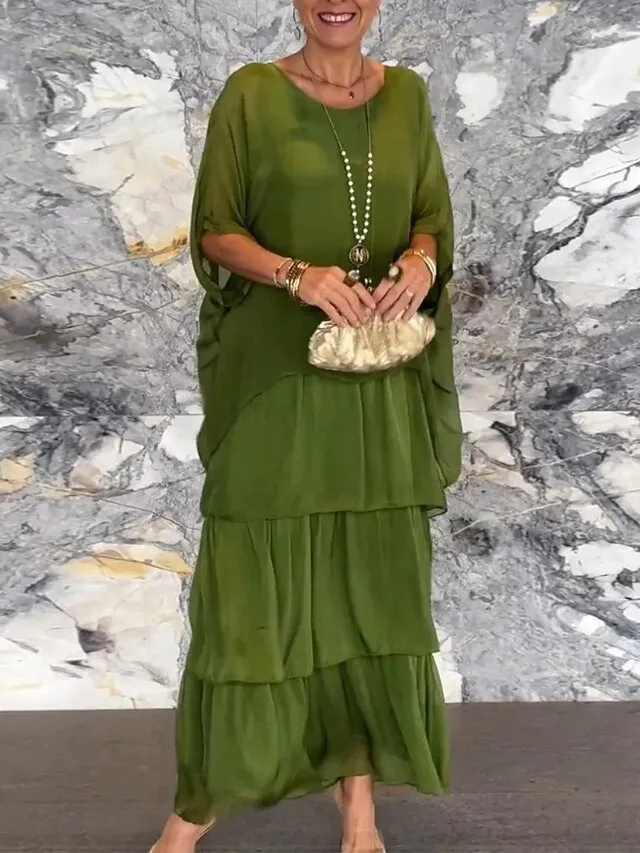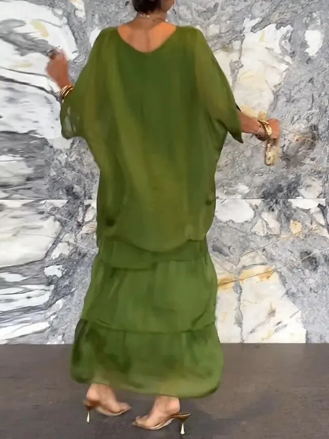 This maxi dress combines effortless elegance with a modern, relaxed look. The layered silhouette and flowing cut create a stylish appearance, making it ideal for vacations, weekends, and special everyday moments.