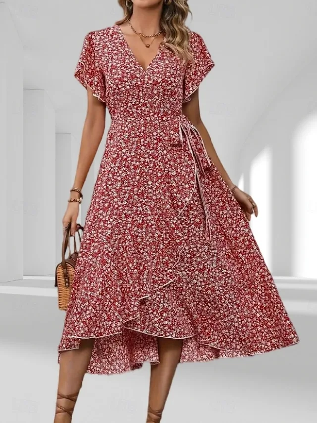This midi dress combines feminine lightness with an elegant, modern appeal. The flattering wrap design and floral pattern make it a stylish companion for vacations, nights out, and relaxed days with a special charm.