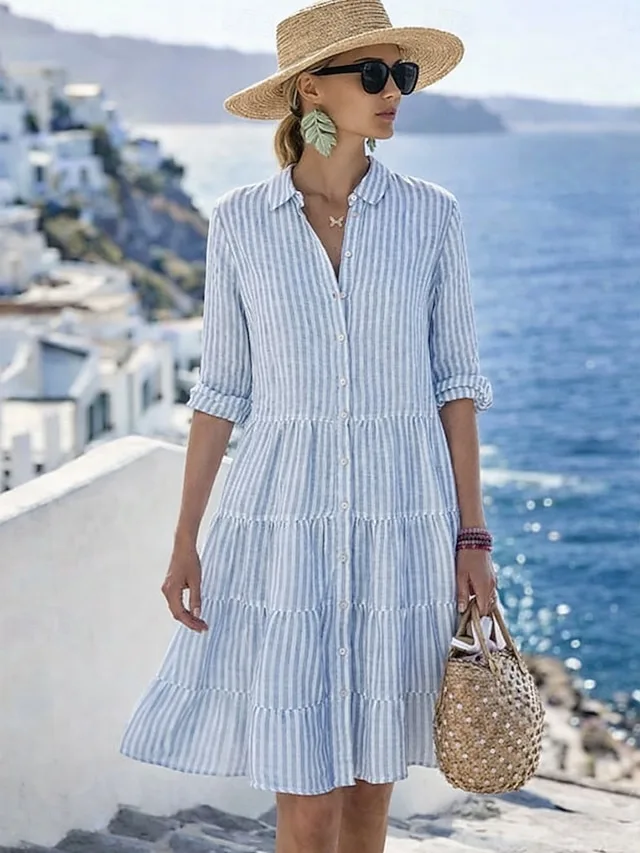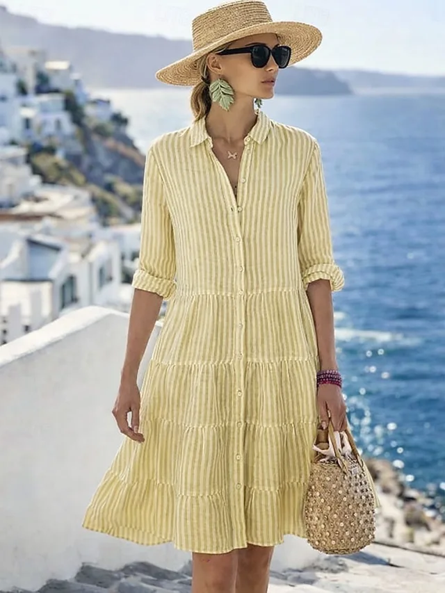 This striped mini dress combines effortless casualness with an elegant, modern flair. The lapel collar and long sleeves add a stylish touch, while the loose silhouette ensures comfortable wear for everyday activities.