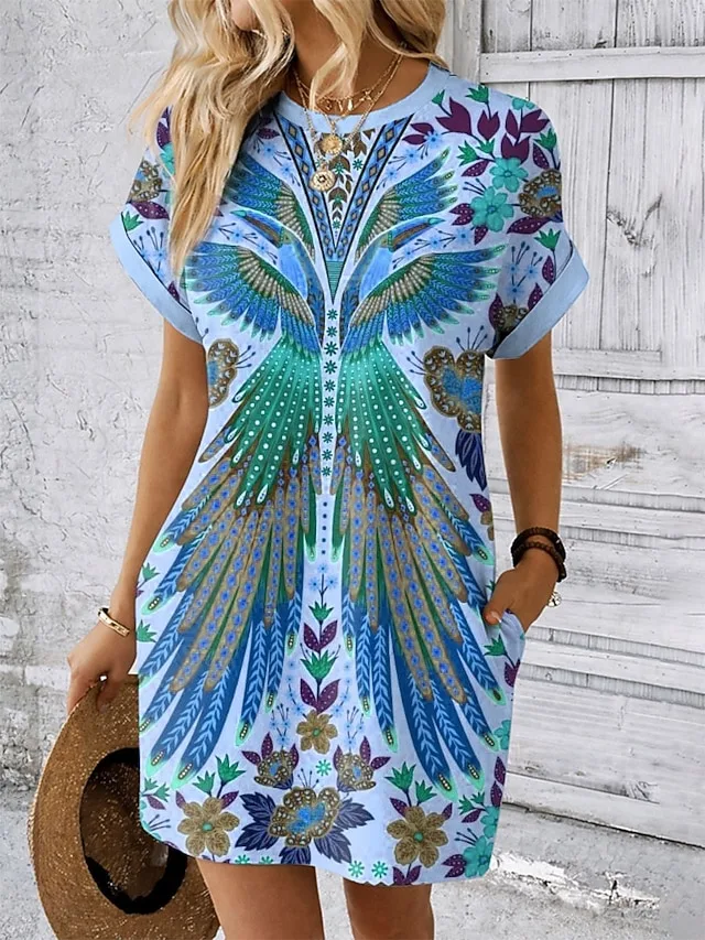 Stylish graphic mini dress with a crew neck and short sleeves. Perfect for everyday wear, vacations, and dates. Discover now.