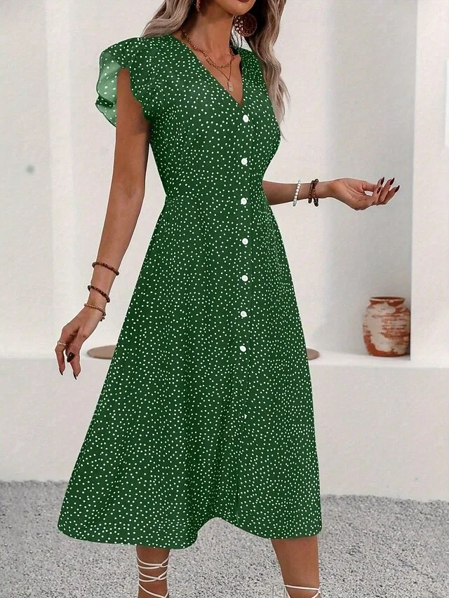 Stylish midi dress with graphic and floral print, V-neck, and slim fit. Discover now and make a summer elegant statement.
